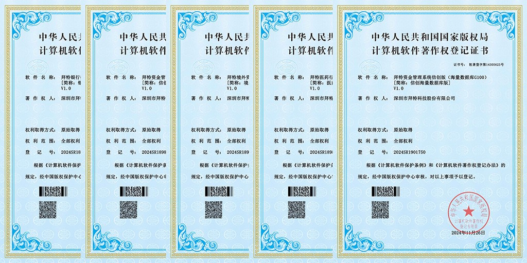 近日,经中国版权保护中心严格审核,国家版权局正式认定深圳市拜特科技股份有限公司自主研发的《拜特境外资金管理系统软件》《拜特医药行业资金管理系统软件》《拜特资金管理系统信创版(人大金仓KingbaseES)》《拜特资金管理系统信创版(海量数据库G100)》《拜特银行接口监控系统软件》五项软件著作权为原始取得,并颁发了国家计算机软件著作权登记证书。