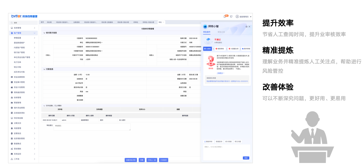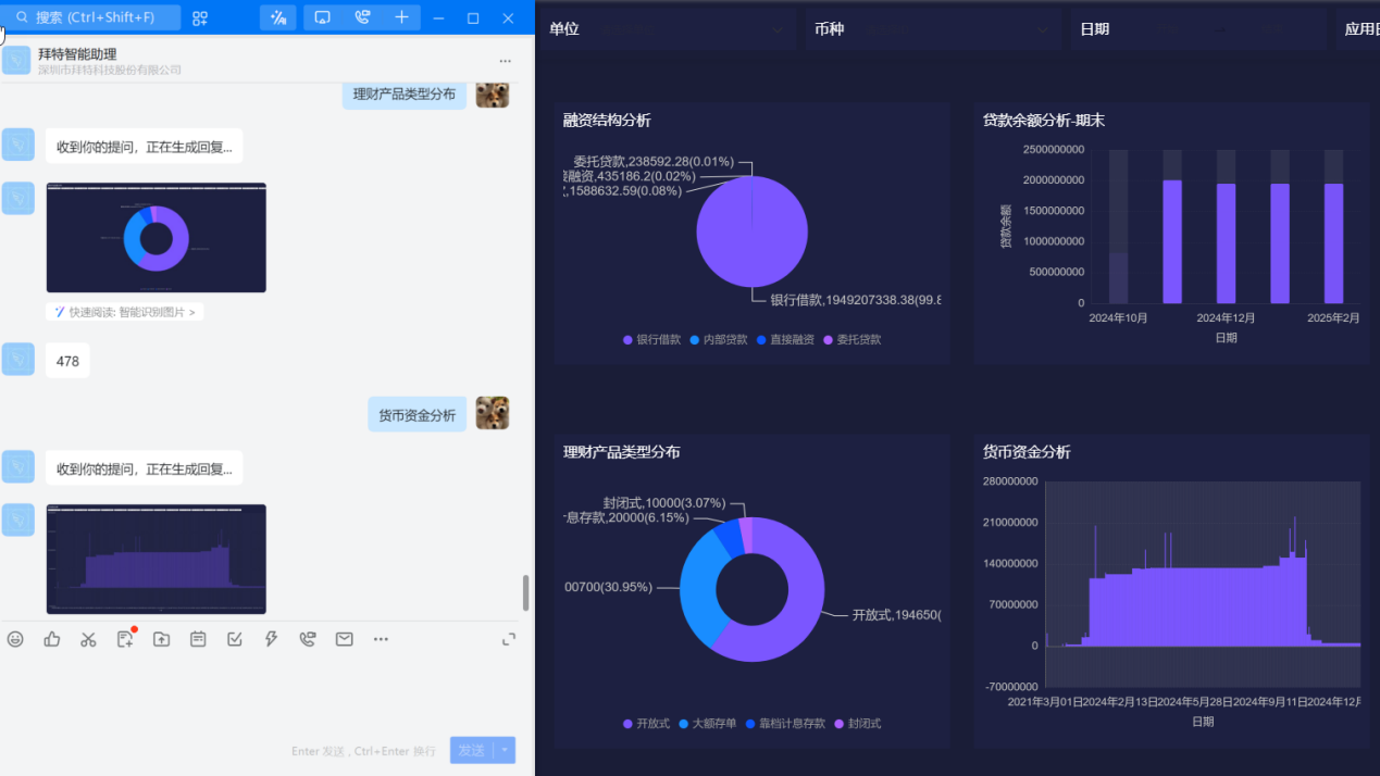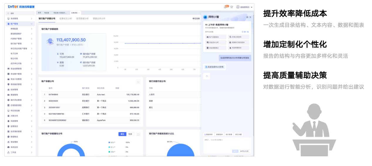 拜特司库业务系统不仅沉淀了拜特在司库管理方面的深厚积累,更在DeepSeek大模型的加持下,实现智能化水平的显著提升。DeepSeek以其卓越的处理复杂信息、推理能力、开放性和运行成本效益,为拜特司库系统注入强大的智能动力,助力企业轻松应对复杂多变的业务场景,实现更加精准、高效的决策。 以下是拜特司库系统中AI场景的一些应用案例: 智能单据审核 通过大模型语意识别,结合业务规则引擎,对单据中相关要素的勾稽关系进行智能分析,审核。 智能报告分析 向司库管家以自然语言的方法发令,如:生成企业的资金日报、资金计划分析报告、现金流程预测表、资金管理工作周报等资金管理业务报告。 ChatBi 集成企微、钉钉、飞书等IM平台,通过自然语言发出业务查询请求,后台Dify工作流结合大语言模型,对业务逻辑进行智能编排,理解请求意图,执行业务查询。 此次拜特司库系统融合DeepSeek,标志着拜特司库产品在智能化领域的又一重大突破。这不仅是对企业客户需求的深刻洞察和积极响应,更是我们推动AI技术普及和应用创新的有力证明。通过这一升级,我们将进一步助力企业实现司库管理的全面数智化转型,提升财务管理效率,降低运营成本,为企业带来实实在在的经济效益。 未来,拜特将持续深耕AI技术,探索智能资金预测,智能风险管控等智能业务场景,并携手更多生态伙伴,共同推动数智化转型的浪潮。我们将以更加开放的心态和创新的精神,为企业提供智能、高效、便捷的司库解决方案,助力企业迈向世界一流水平。让我们携手共进,共创司库管理的新纪元! 即刻联系拜特科技,体验DeepSeek大模型赋能的下一代司库系统!让我们共同见证:每个数字皆可计算,每笔资金皆有智慧。