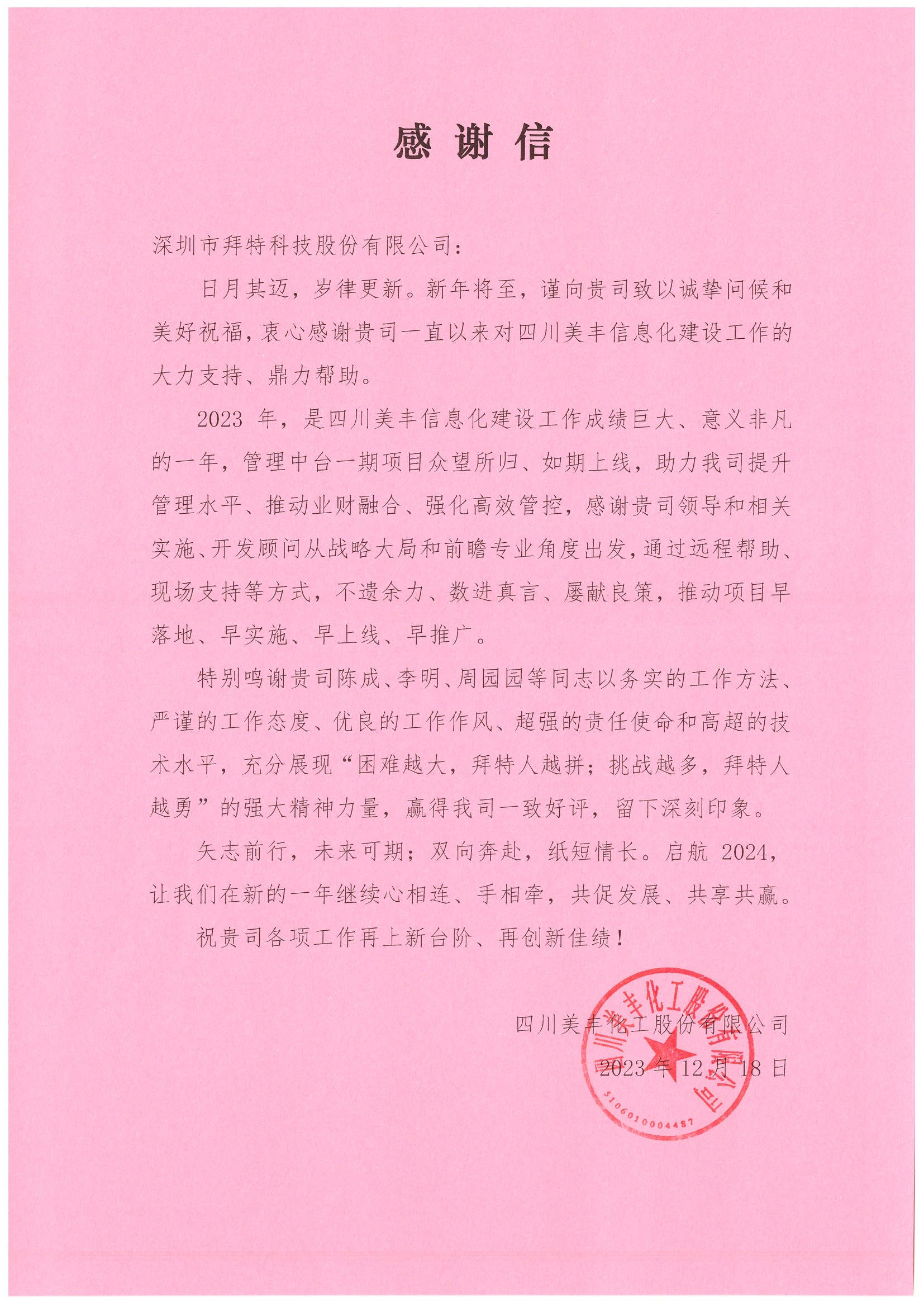 信中指出,2023年是四川美丰信息化建设工作成绩巨大、意义非凡的一年,管理中台一期项目众望所归、如期上线。拜特科技助力四川美丰提升管理水平、推动业财融合、强化高效管控等方面卓见成效,充分展现“困难越大,拜特人越拼;挑战越多,拜特人越勇”的强大精神力量,赢得了四川美丰的高度赞扬。