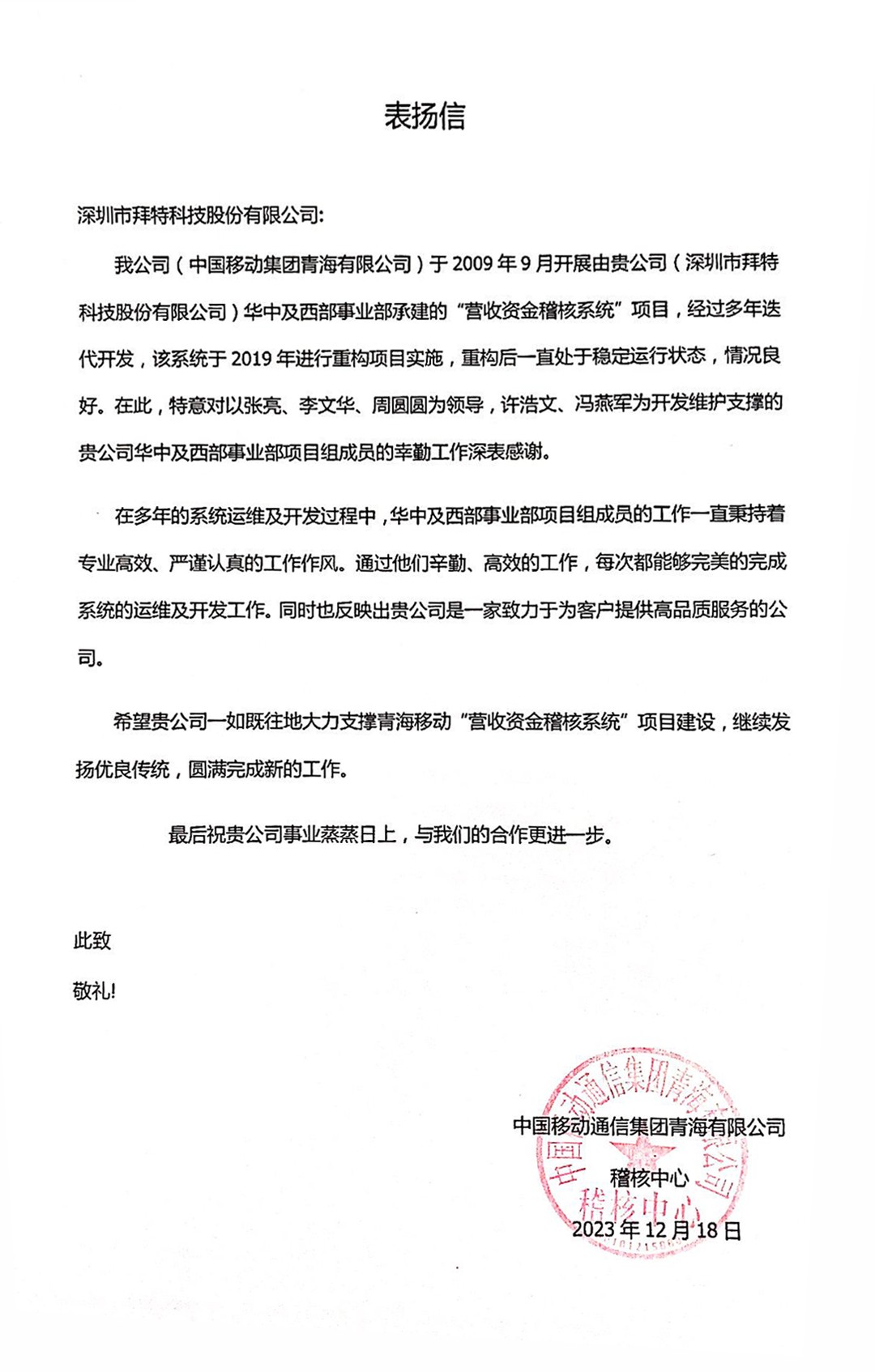 信中指出,中国移动通信集团青海有限公司从2009年与拜特科技开展项目合作,经过多年的迭代升级开发,系统一直处于稳定运行状态。拜特科技项目人员一直秉持着专业高效、严谨认真的工作作风,致力于为客户提供高品质服务。