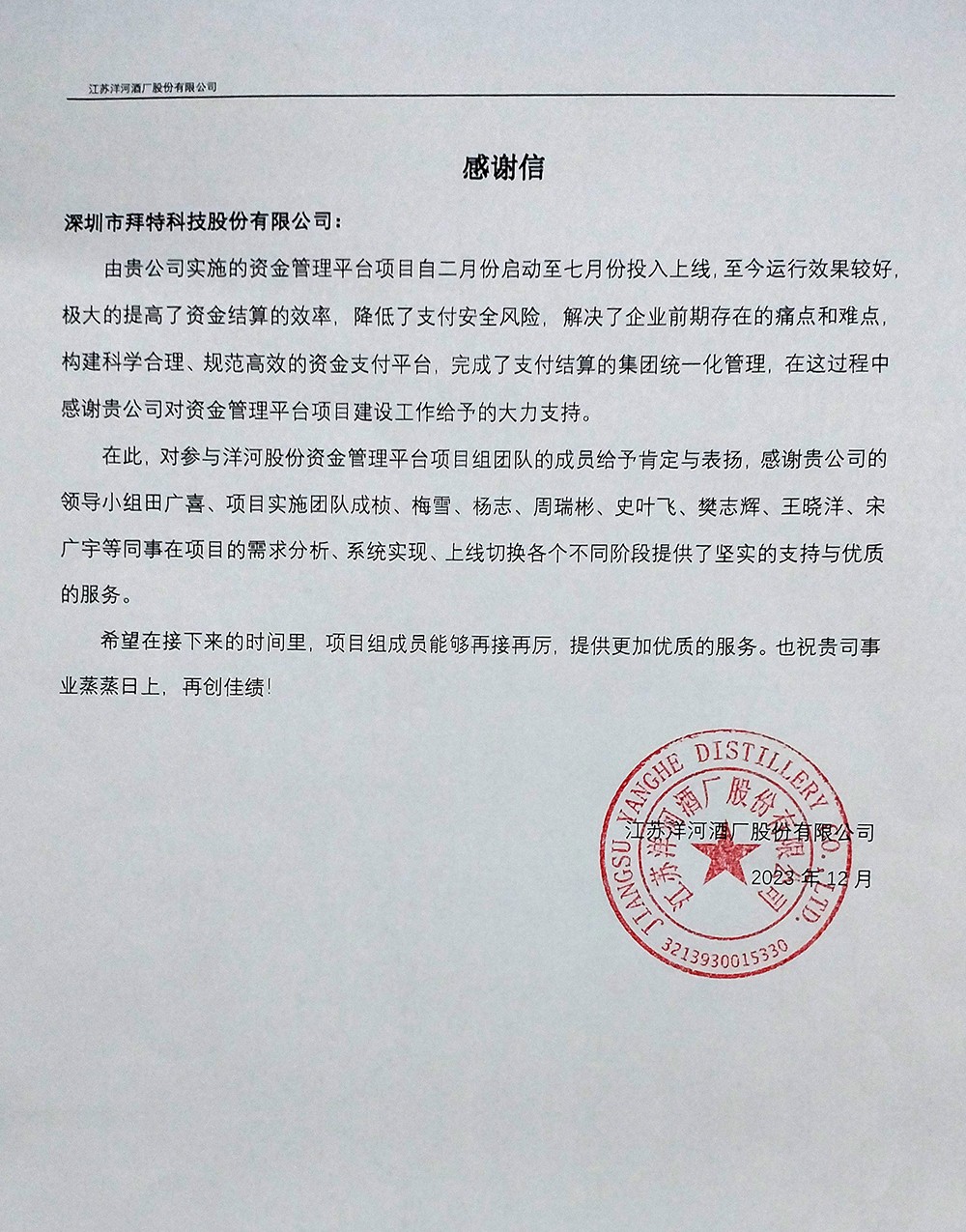 信中指出,洋河股份资金管理平台项目,至今运行效果较好,极大地提高了企业资金结算效率,降低了支付安全风险,解决了企业前期存在的痛点和难点,完成了集团统一化管理。对参与洋河股份的拜特科技项目组人员给予肯定和表扬,在项目需求分析、系统实现、上线切换各个不同阶段提供了坚实的支持与优质的服务。