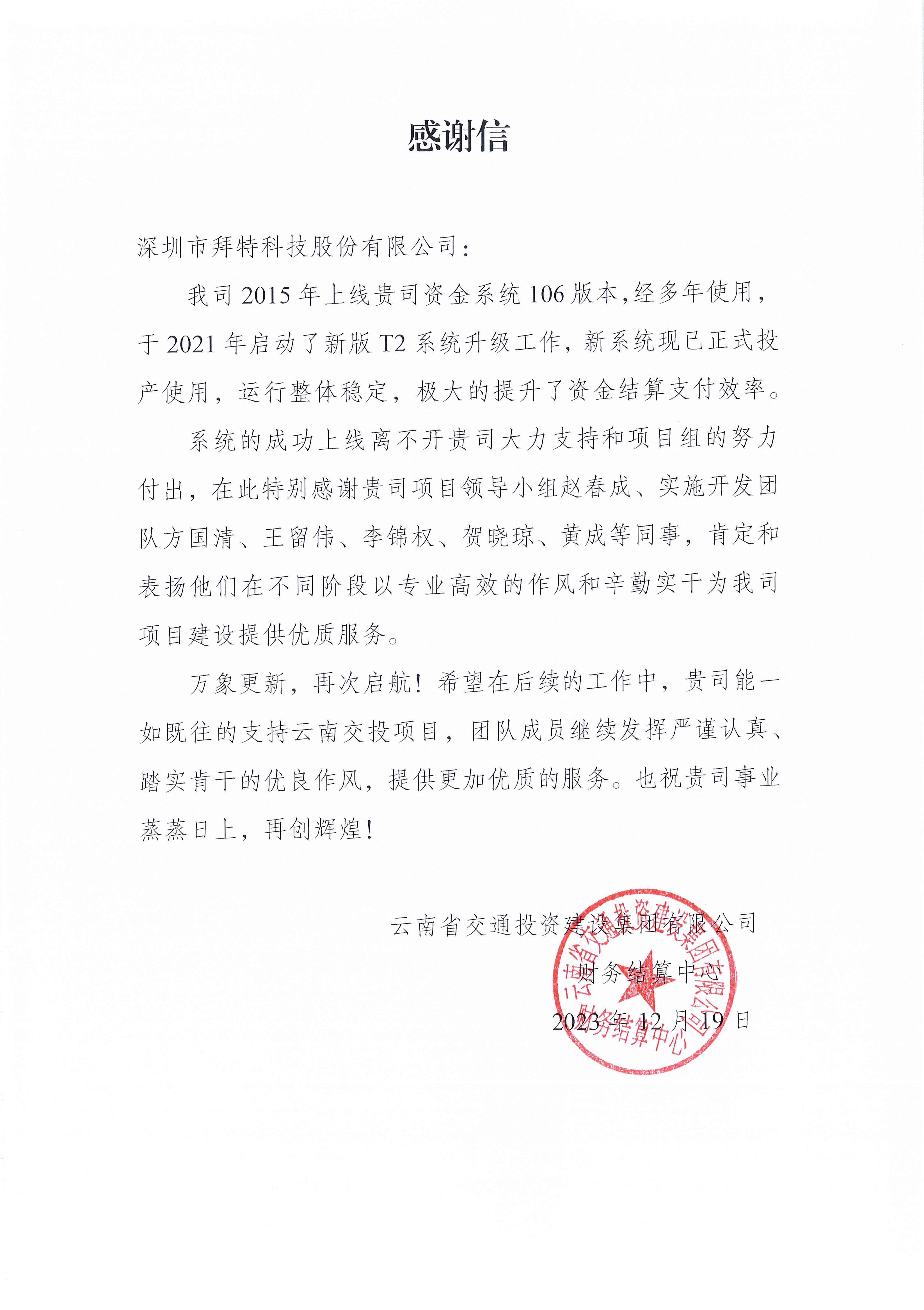 信中指出,云南交投项目自2015年上线资金系统,经多年使用,于2021年启动了新版系统升级工作,现已正式投入使用,运行整体稳定,极大地提升了资金结算支付效率。系统的成功上线离不开拜特科技的大力支持和项目组人员努力付出,特别感谢项目组成员,肯定和表扬他们在不同阶段以专业高效的作风和辛勤实干地为云南交投项目建设提供优质服务。
