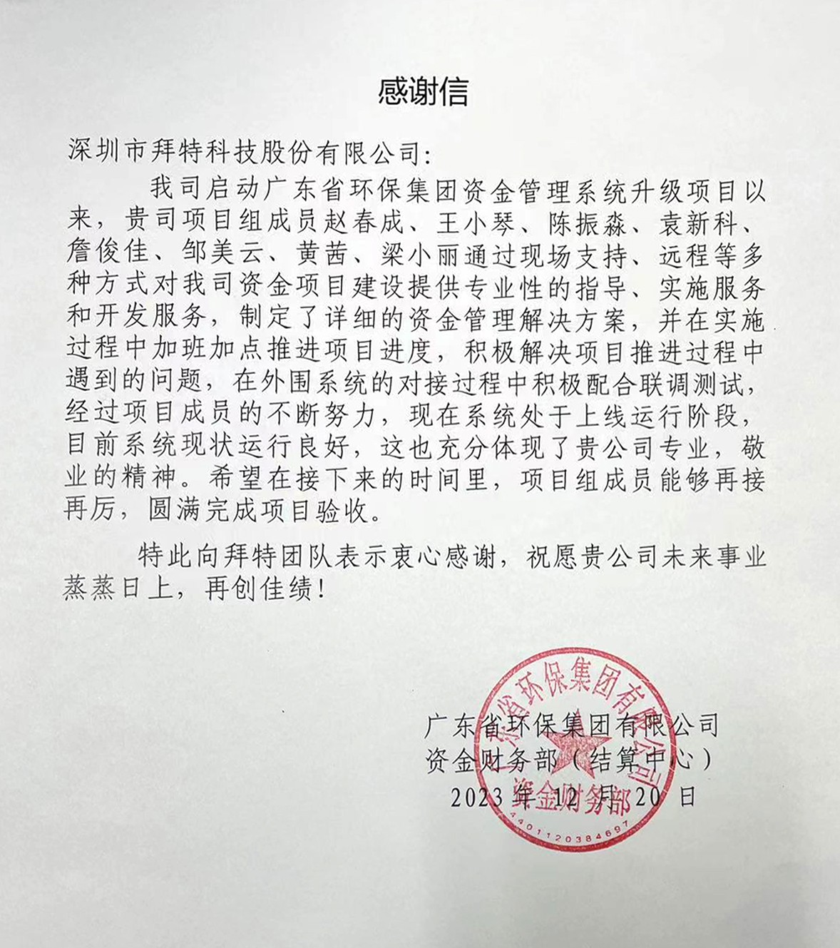 信中提到,广东省环保集团自启动资金管理系统升级项目以来,项目组成员对项目提供专业性的指导、实施服务和开发服务,制定了详细的解决方案,经过项目成员的不断努力,现系统处于上线运行阶段,目前系统运行良好,充分体现了拜特科技的专业与敬业精神。