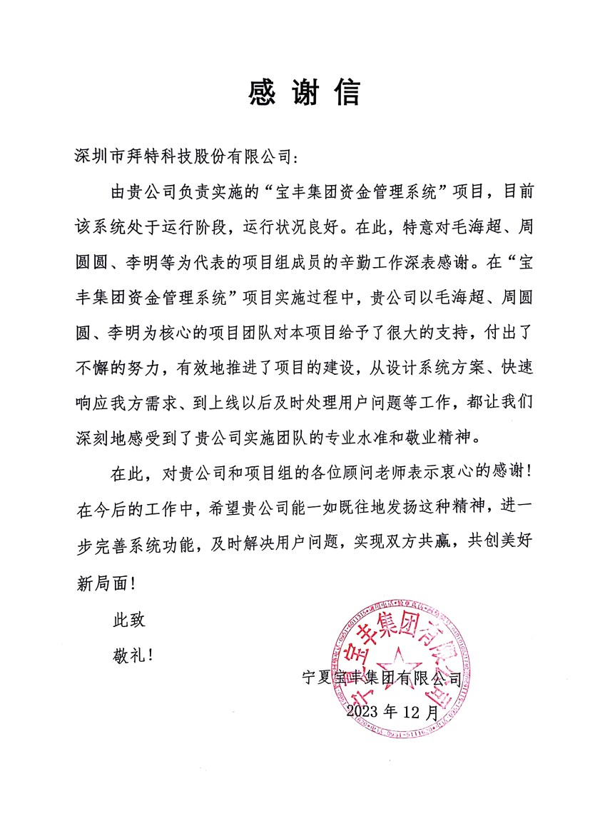 信中提到,由拜特科技负责实施的宝丰集团资金管理系统项目,目前该系统处于运行阶段,运行状况良好。对拜特科技项目组成员的辛勤工作深表感谢,从设计系统方案、快速响应需求、到上线后及时处理用户问题等工作,深刻感受到了拜特科技实施团队的专业水准和敬业精神。