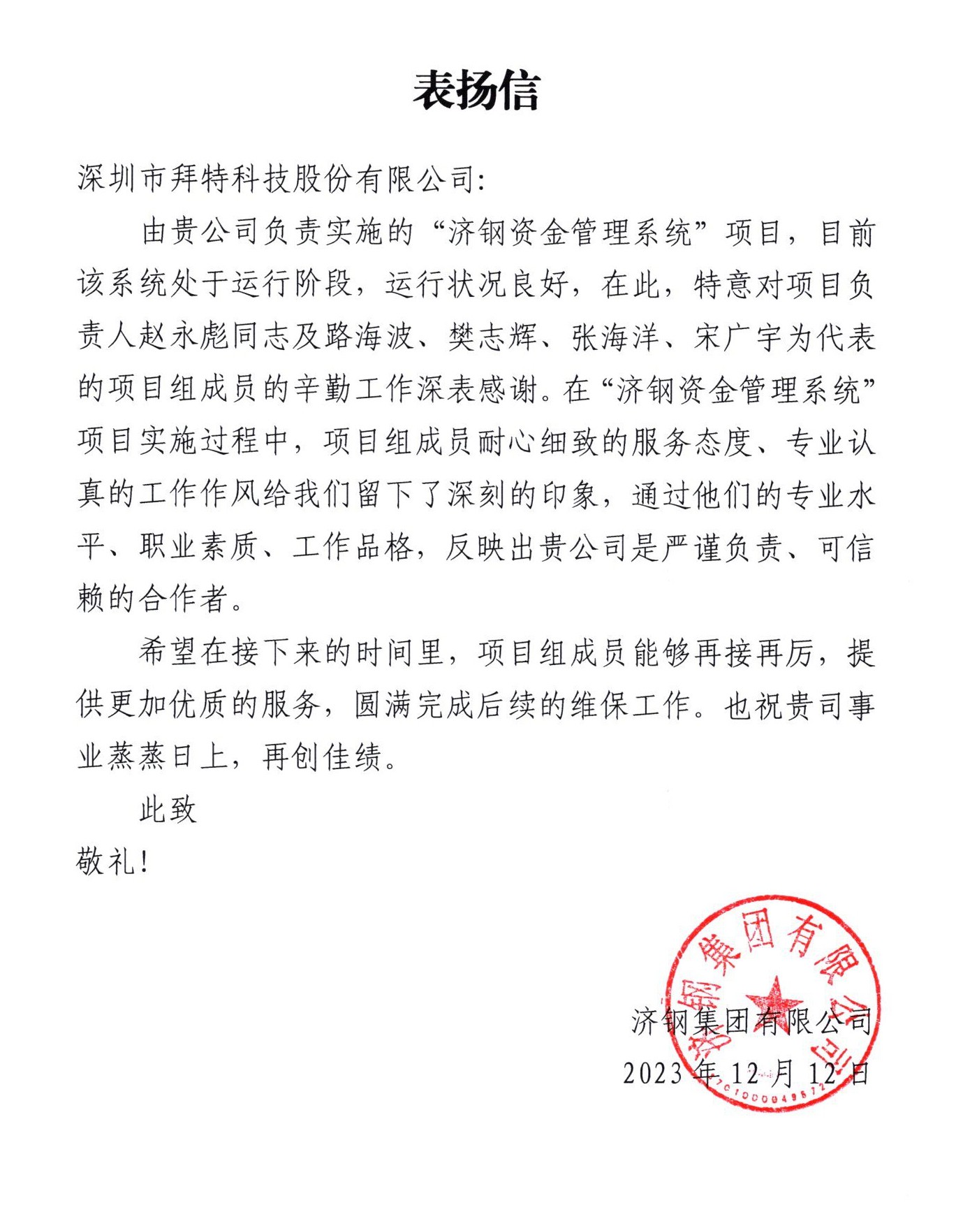 信中指出,济钢资金管理系统项目,目前处于运行阶段,运行状况良好。在项目实施过程中,拜特科技项目组人员发挥出了专业水平、职业素养和工作品格。因此,拜特科技是一个值得信赖的合作伙伴。