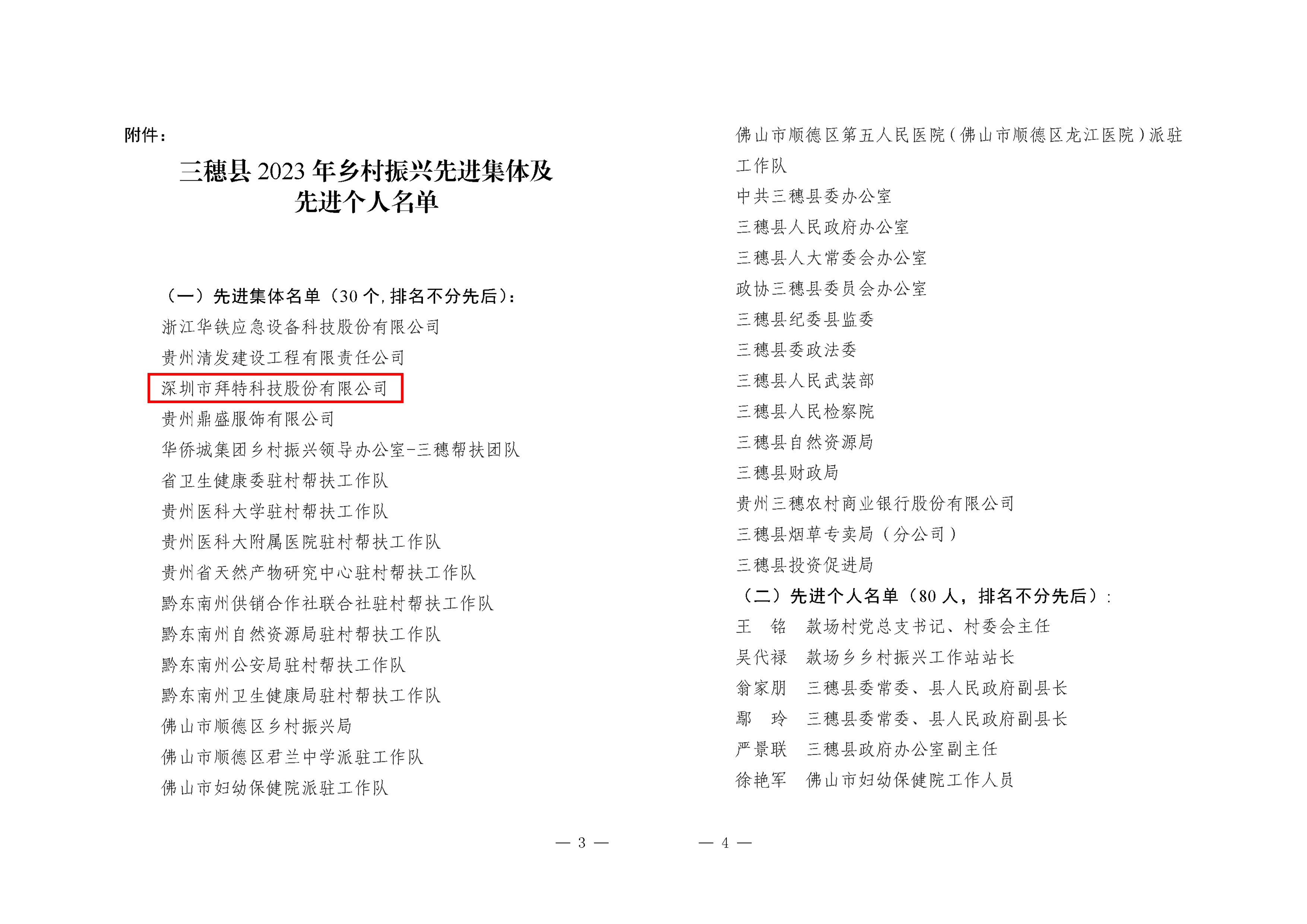 2023年12月27日,中共三穗县委、三穗县人民政府下发《关于表彰三穗县2023年乡村振兴先进集体及先进个人的决定》,拜特科技荣获“三穗县2023年乡村振兴先进集体”称号。