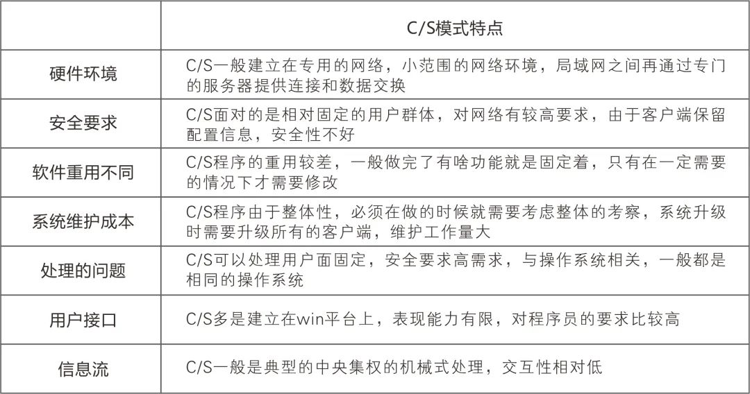 C/S模式,即Client/Server或客户/服务器模式,是服务器客户端结构。是一种“一对多”的模式,一台服务器,处理多个客户端发来的请求,完成了业务逻辑之后,再返回给客户端一些信息。