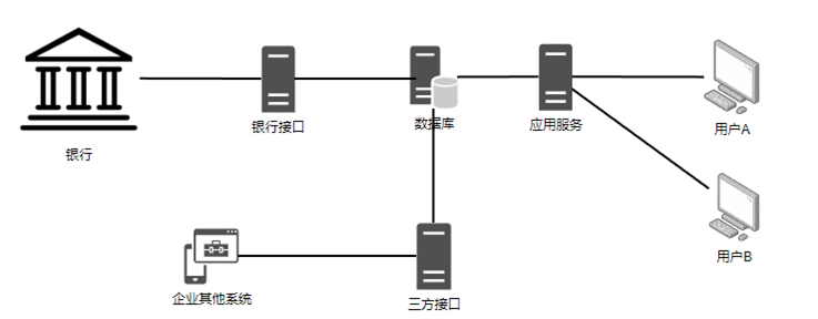 时间来到2006年,拜特科技的产品架构也迎来了B/S架构模式,应用服务,第三方接口服务,银行接口平台服务也需要独立部署,用户客户端不用直连数据库,所有的交互式业务操作都直连应用服务完成,在部署上,需要专门的应用服务器,第三方接口服务器,银行接口服务平台服务器。简单结构图如下: