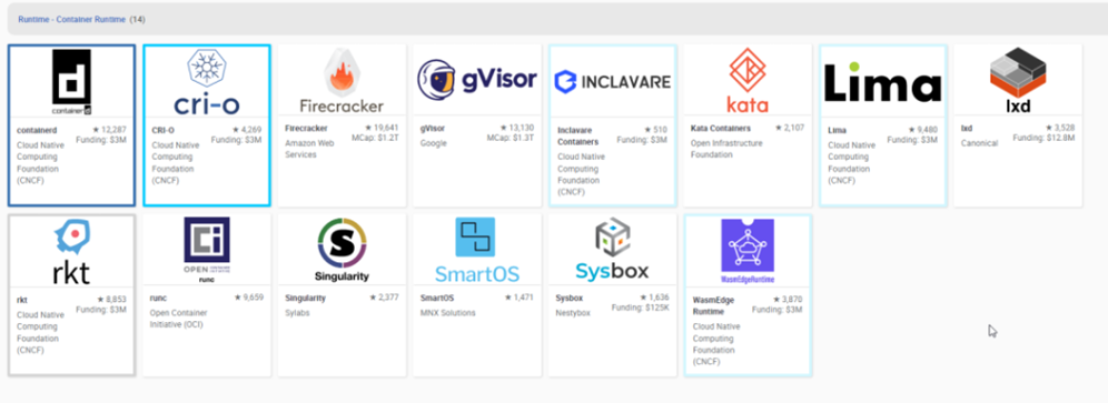 提供容器化的产品有很多(docker/podman/cri-o/containerd 等),但最有名非Docker莫属 。下面是CNCF推荐的一些容器运行时产品介绍: