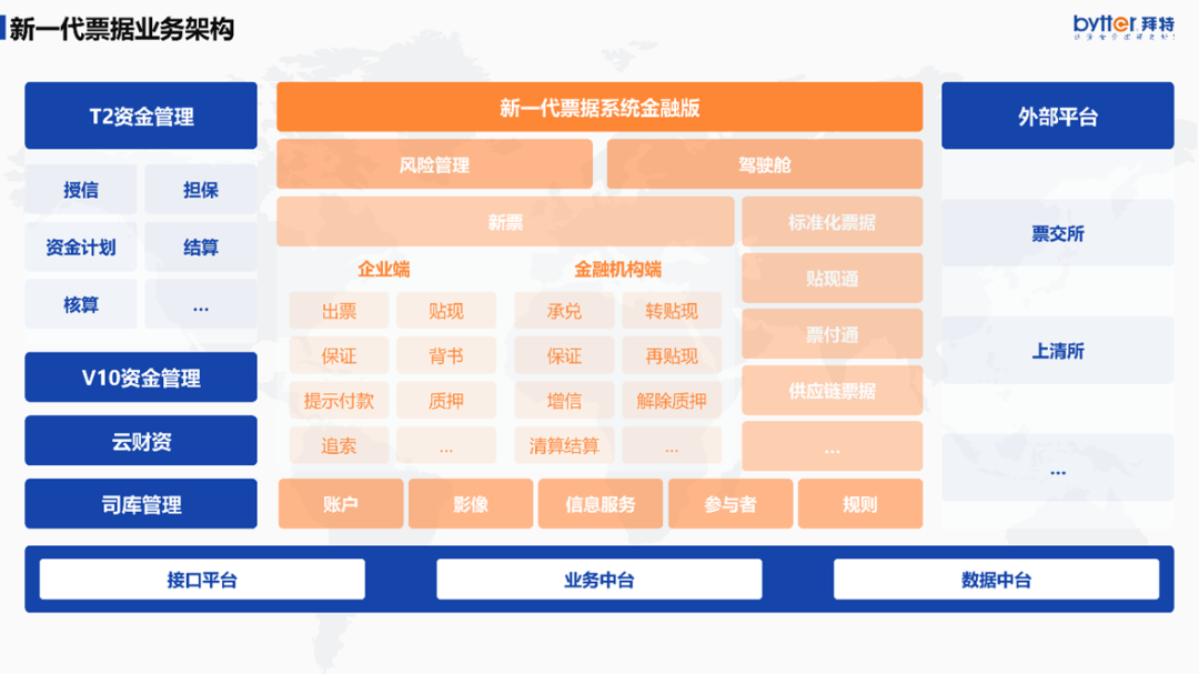 拜特新一代票据系统从系统架构上分为企业端与金融端。企业端为单一企业客户或者集团客户提供票据管理服务,可进行开票、背书、贴现、承兑等一系列票据业务操作。金融端为银行、财务公司等金融机构提供票据管理平台,可以管理客户及其票据承兑、确认等业务,另外也管理背书、转贴、再贴、清算等自身票据业务。同时分别针对企业端和金融端诉求定制风险管理和驾驶舱指标。