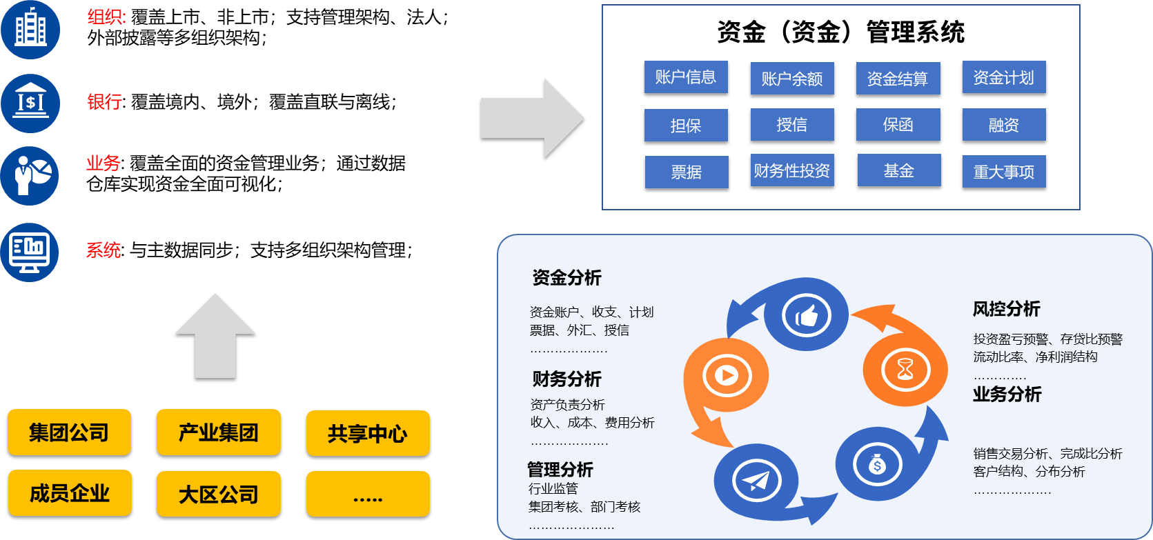 基于资金管理系统数据中心(资金系统接口),构建多业务维度、多模式的资金数据可视化综合分析平台,实现全面、及时、高效和准确的资金管理信息反馈,为集团公司财务部门的管理决策、预测评价提供参考,为全集团公司财务监管、提升资金管理水平提供支撑。
